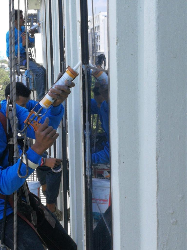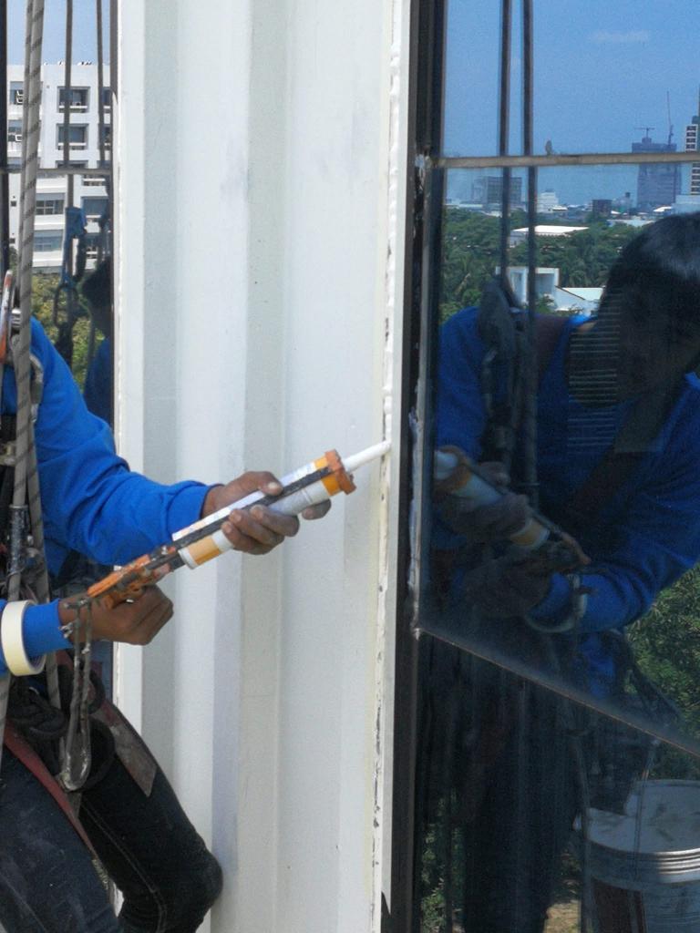 บริการ งานโรยตัวยิงซิลิโคนกระจกหน้าต่างอาคารสูง สำหรับแก้ไขปัญหาซิลิโคนเสื่อมสภาพ น้ำรั่วซึม และลมรั่วตามขอบกระจก ช่วยเพิ่มความแน่นหนา ป้องกันความเสียหายจากน้ำ และยืดอายุการใช้งานของกระจกและโครงสร้างอาคาร ดำเนินงานด้วยความประณีตและคำนึงถึงความปลอดภัยเป็นหลักทำไมต้องเลือกเรา